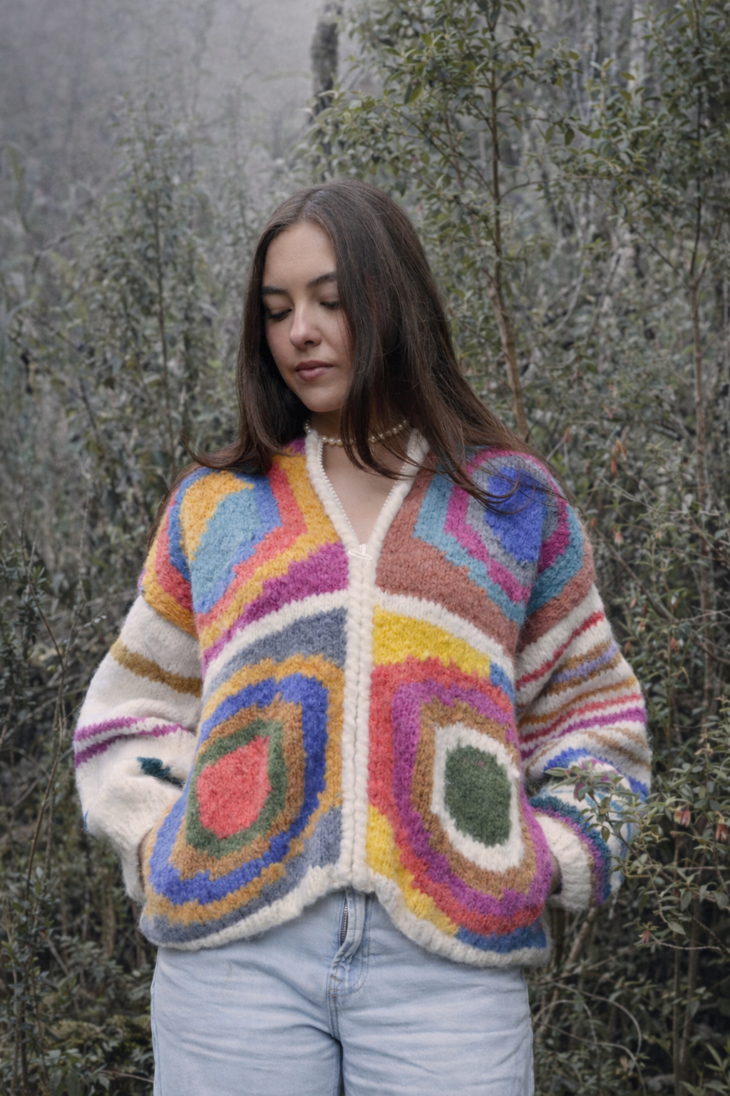 Crafted from a premium 79% baby alpaca blend, this cardigan features bold geometric colorwork and a soft, structured silhouette. Warm yet lightweight, it is handcrafted in Ecuador and designed as a refined statement layering piece.