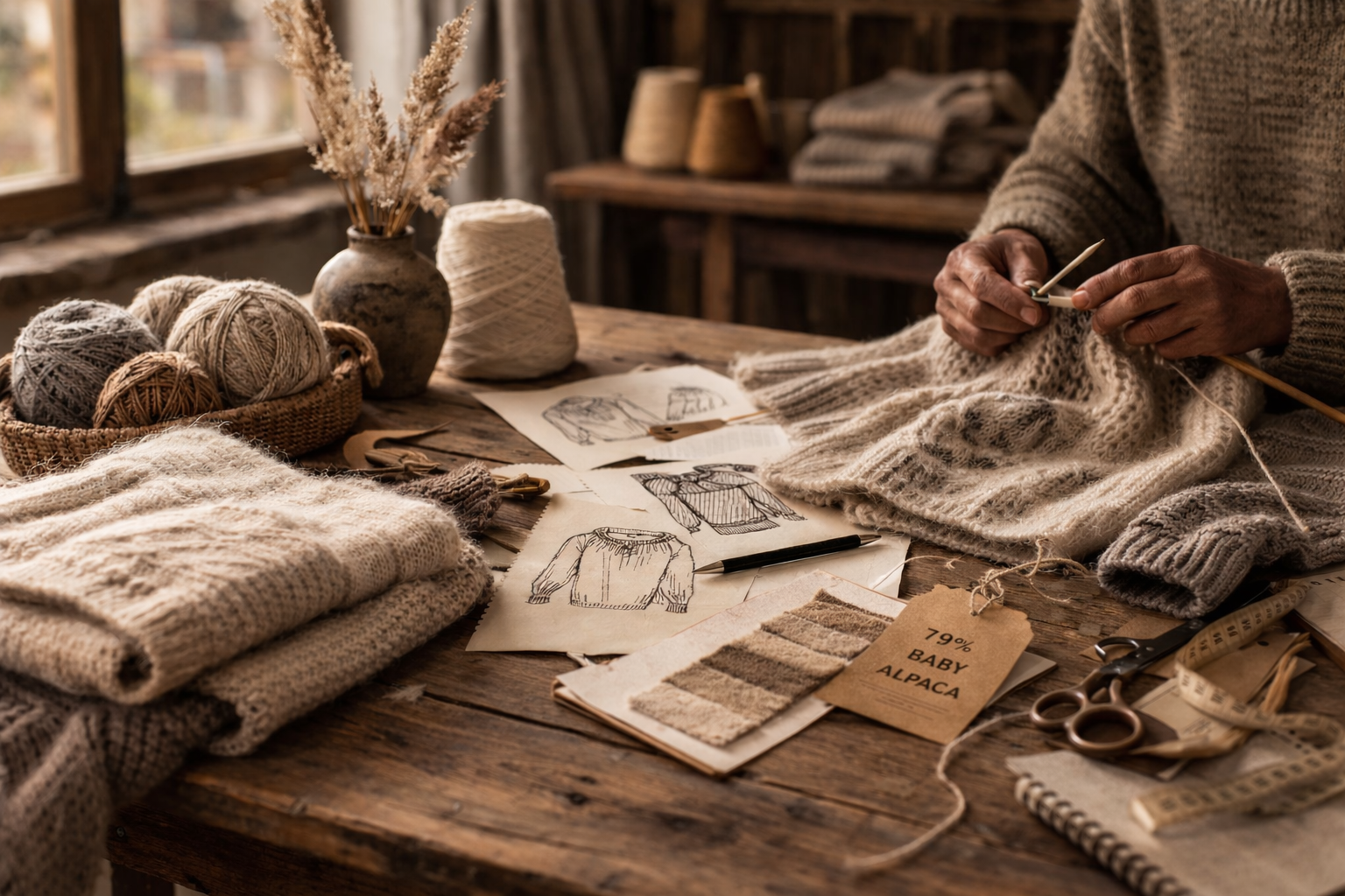 We work with exceptional natural materials such as baby alpaca and merino wool, valued for their softness, warmth, durability, and comfort.